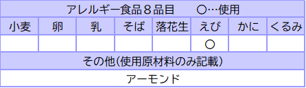 TOP小袋その他 アーモンド(小袋) 価格: ¥300 (税込) 販売期間: 数量: 袋 在庫: ○ 在庫 ○ 返品についての詳細はこちら アーモンド入りのえびせんべい、素焼き 内容量 45g 賞味期限 120日